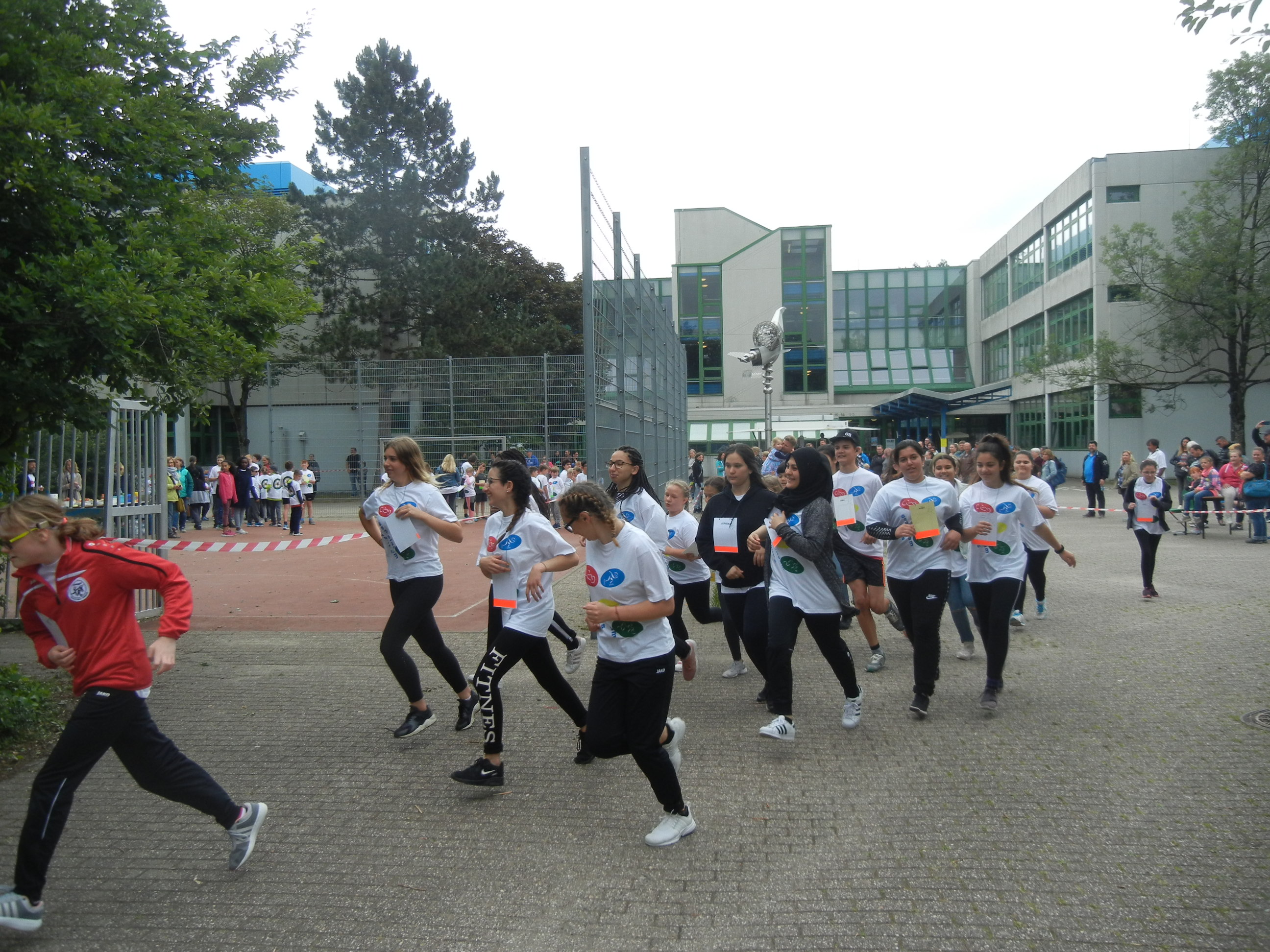 Für den Lauf hatten die Schüler zuvor fleißig trainiert und eifrig Sponsoren geworben. Neben den Eltern hatten sich auch viele Firmen als Sponsoren gemeldet. Die in Langenfeld beheimatete Weik-Stiftung von Elisabeth und Bernhard Weik hatte jeden Teilnehmer mit einem T-Shirt und fünf Euro Startkapital ausgestattet.