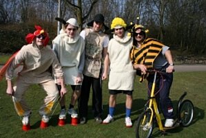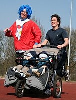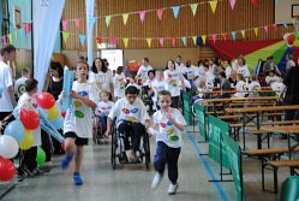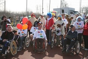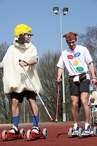 Alle Beteiligten waren bester Stimmung und so nahm der Tag einen wundervollen Verlauf. Noch fehlte uns die Zeit für die Auswertung, aber es sind sicherlich mehr als 2000 Runden von unseren ca. 220 Schülern absolviert worden. Zum Abschluss der Läufe gab es noch einen Erwachsenenlauf. Das Besonderes daran war, dass sehr viele Lehrer oder Therapeuten verkleidet oder aber mit unterschiedlichen Fahrzeugen (Rooler, Rollski, Pedalos, etc.) unterwegs waren.