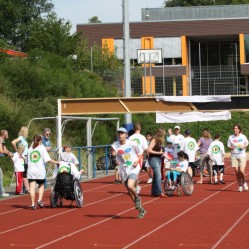 Zum Gelingen der Veranstaltung trugen neben Ihrer Grundfinanzierung und Stiftung der farbenfrohen T-Shirts, die Wasserwerke mit einer Wasserbar, die Eltern mit einem Obststand bei. Im Sinne des Inklusionsgedanken unterstützten uns 50 Schüler des benachbarten Gymnasiums an den Stempelstationen. Die Firma HASE BIKES stellte Spezialfahrräder für Menschen mit Behinderung kostenlos zur Verfügung.